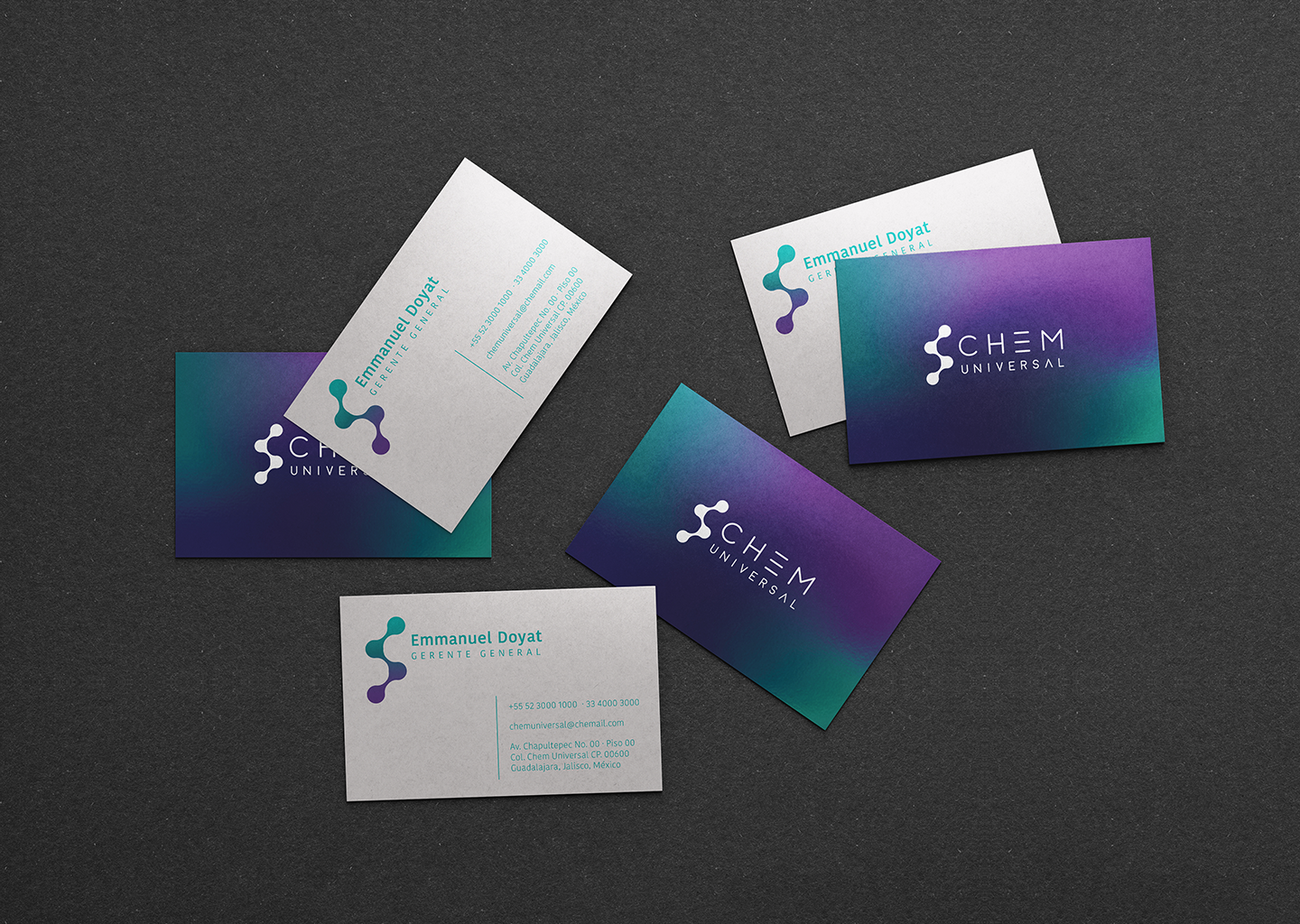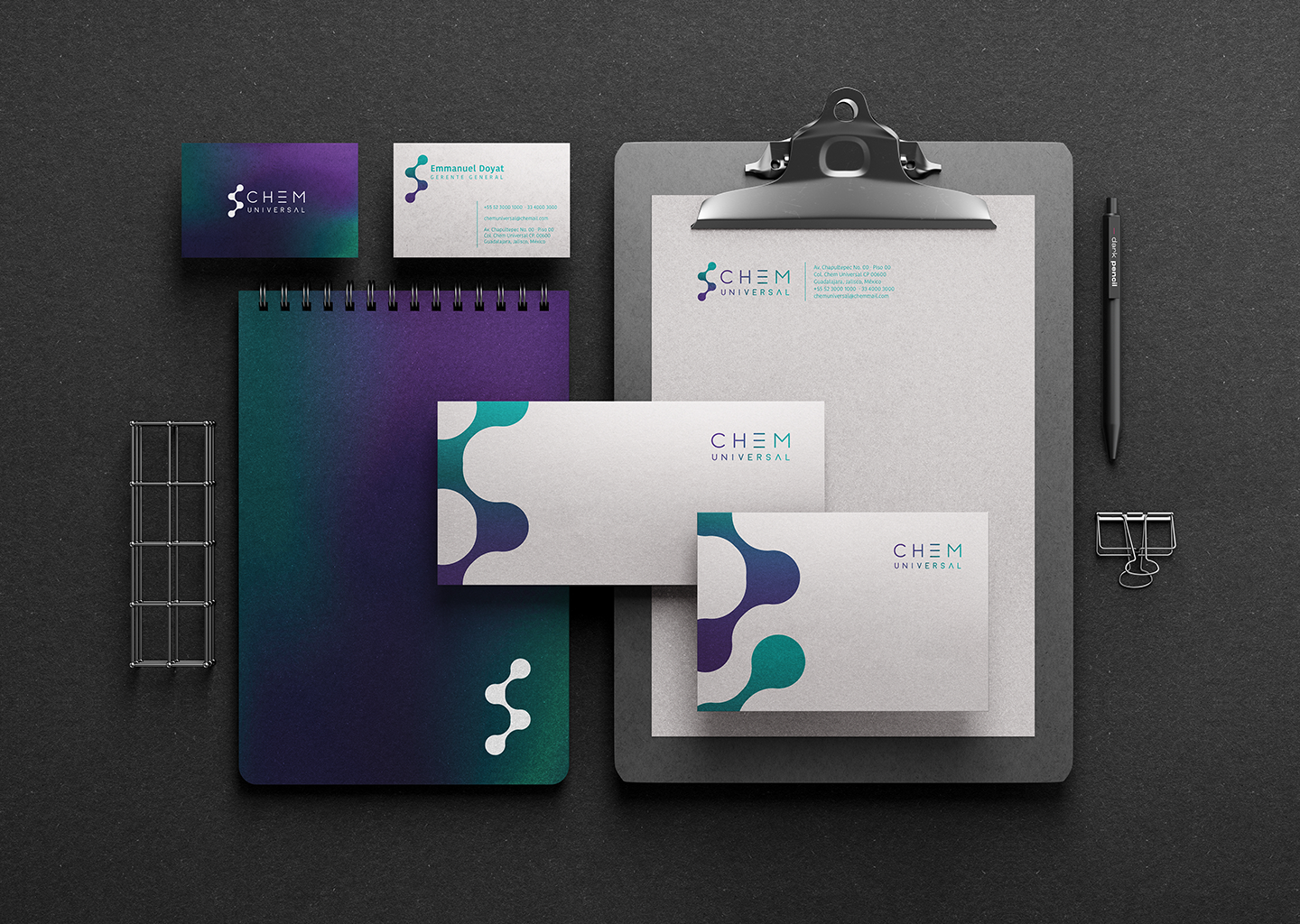 El desarrollo de la identidad corporativa de Chem se basa en la creación de una imagen moderna, minimalista y atemporal. El logotipo refleja simplicidad y universalidad, asegurando una presencia sólida y versátil en distintos medios. El imagotipo se inspira en la estructura molecular, simbolizando la mezcla y transformación de sustancias químicas, esencia del trabajo de Chem.