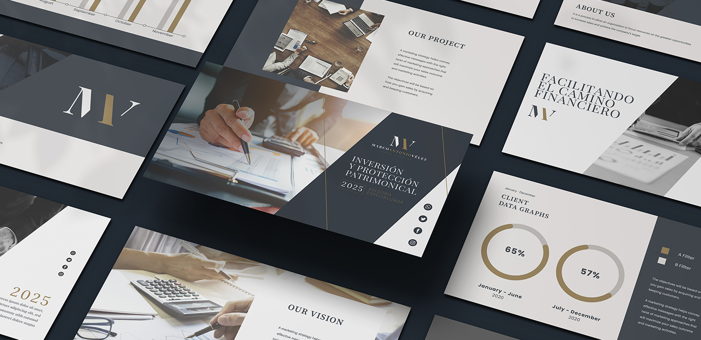 La identidad visual diseñada proyecta a Marco Vélez como un asesor serio y experimentado, a la vez accesible y moderno, generando una sensación de confianza y seguridad en quienes buscan mejorar su situación financiera.